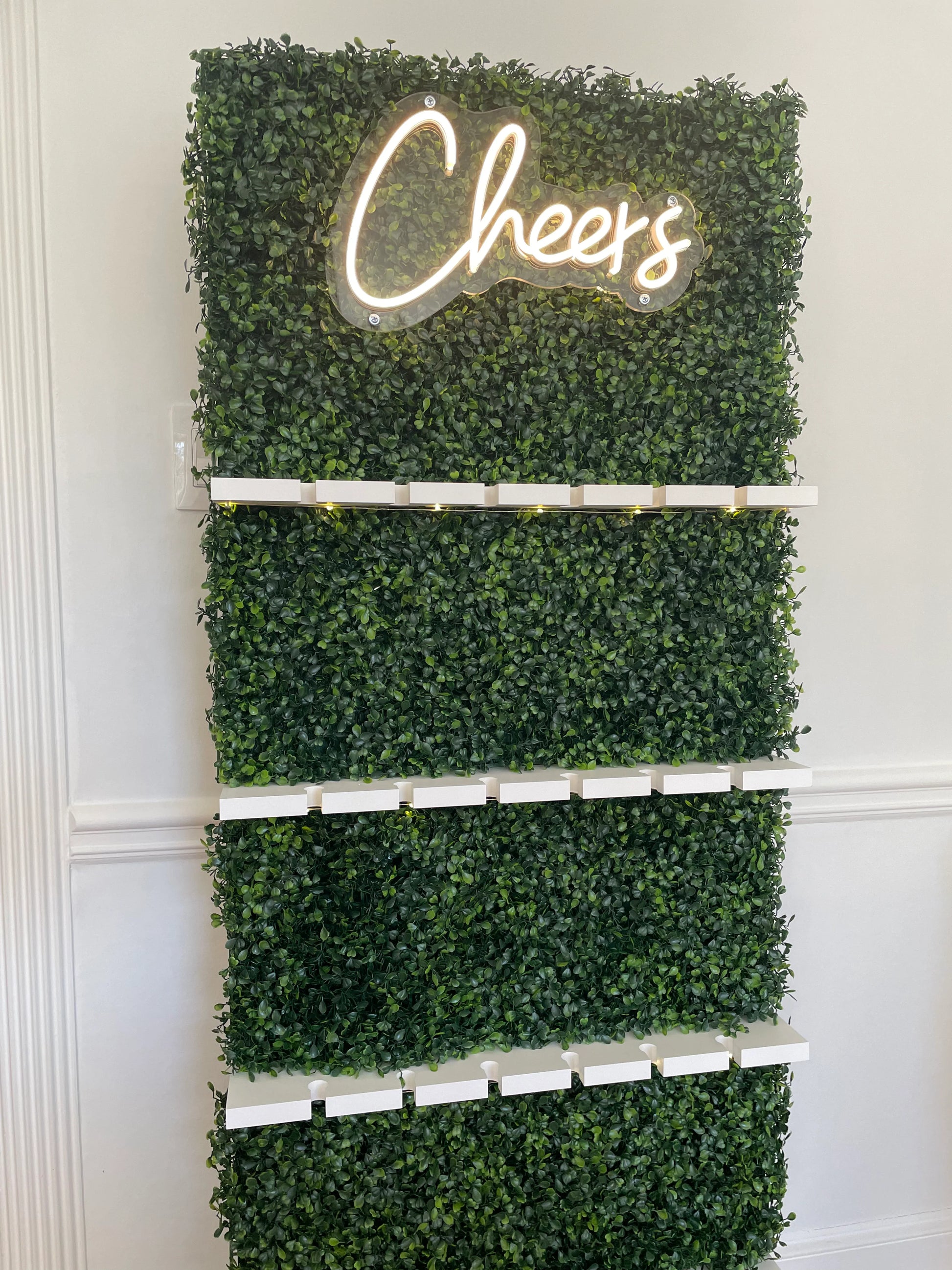 This boxwood champagne wall is a fun way to create a wow factor for any party, baby shower, wedding, birthday party, trade show and more! A fun, creative way to serve your guests! This eye-catching piece can be the center of attention or an interesting side bar. Don't be limited by it's name - this wall can be used for favors, treats and desserts as well.