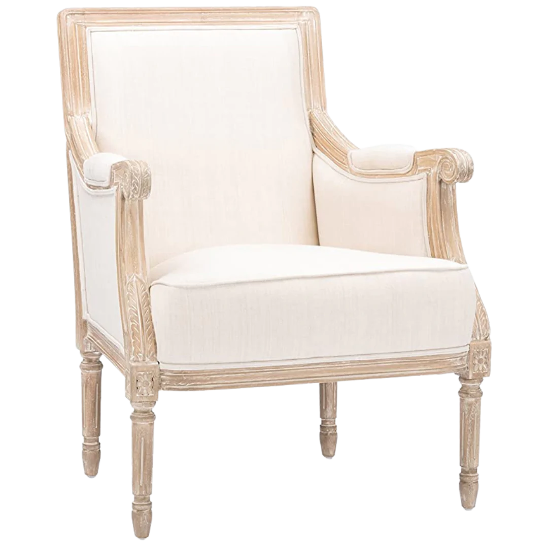 A distressed, antiqued finish complete with authentic white streaking distinguishes our Chavanon Wood Traditional French Accent Chair bringing traditional style to the modern age. This farmhouse accent chair offers visually versatile foam-cushioned, beige cotton upholstery.